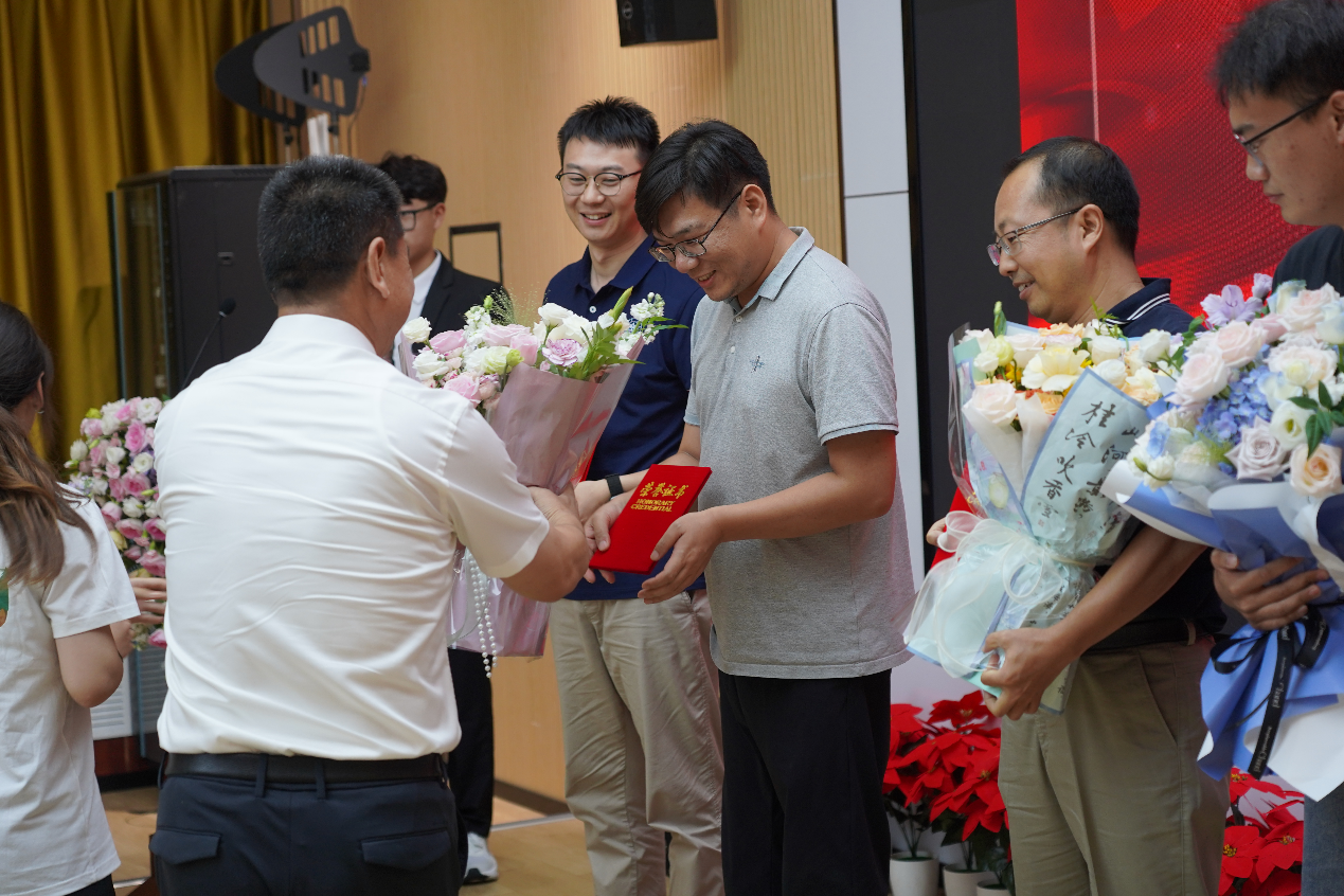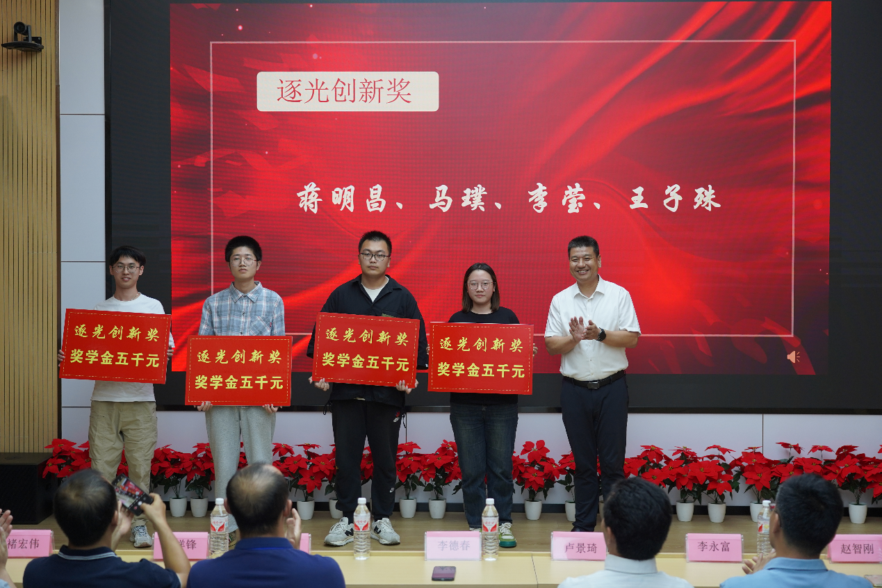在会议表彰环节,李德春为蒋明昌等四位同学颁发了逐光创新奖,表彰他们在科研道路上取得的优异成绩;为褚宏伟等四位教师颁发了优秀指导教师奖,感谢他们在学生科研成长之路上的精心指导与辛勤付出。