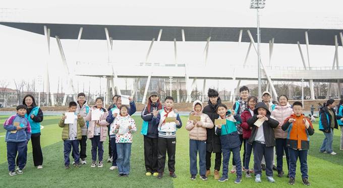 植树结束后,学院精心设计了“管道传乒绘图”、“两人三足接力绘画”和“踏石过河猜图”互动项目。游戏结束后,大学生们与小学生们围坐交流,志愿者们分享了自己的学习经验和成长故事,鼓励孩子们树立远大理想,努力学习,像那一棵棵小树苗一样,向下扎根,向上生长,早日成为国家的栋梁之才。最后,学院光电科创未来精英班的同学们为小学生佩戴上专属的班徽,并送上精心准备的手写信,写满了对小学生的鼓励与期许,将希望与期待传递给小学生们。