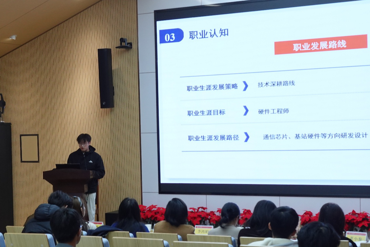 而在成长赛道的展示中,选手们立足个人成长轨迹,结合专业特色明确发展方向,从嵌入式软件工程师到集成电路研究员等多个细分领域的规划,生动呈现出他们在学术探索与实践历练中逐步提升综合能力的清晰脉络。评委老师们围绕职业目标匹配度、学习实践方案可行性、规划优化空间等多个关键维度进行全面评估,为每位选手提供了定制化的专业指导,助力学子完善规划、明确方向。