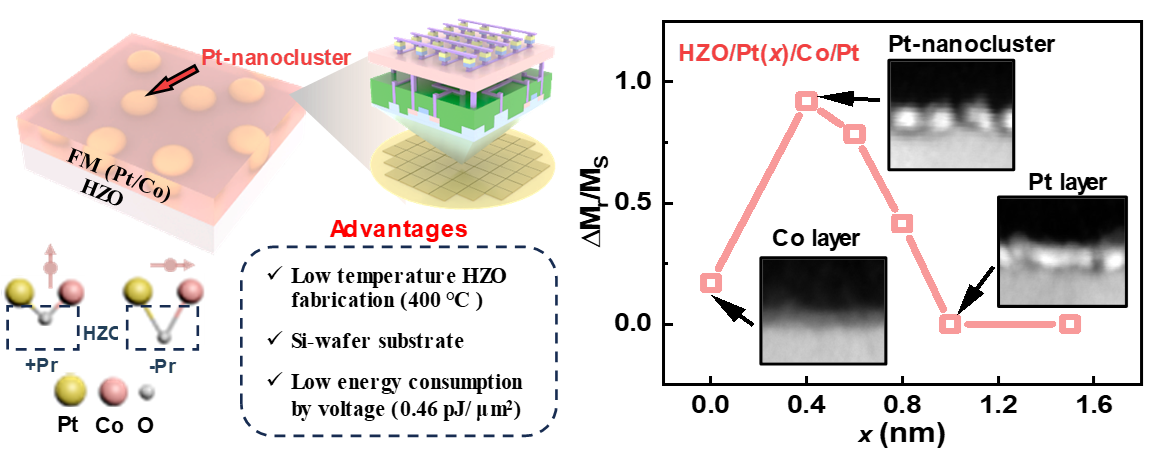 • 目前,传统电流驱动式自旋器件普遍面临高能耗问题,而电压驱动磁电器件虽具备超低写入能耗优势,却在CMOS工艺兼容性方面面临衬底材料与加工温度等挑战。围绕这一问题,课题组与中国科学院微电子研究所等单位联合开发出一种基于“铪基铁电-Pt/Co纳米团簇”结构的新型磁电器件。该器件通过Pt纳米团簇对Co-O键合行为及铪基铁电层中氧迁移过程的精细调控,实现了低能耗的电压驱动磁反转。该成果为构建CMOS兼容的低功耗磁电逻辑与存储集成技术提供了重要支撑。中科院微电子所博士生龚帅宇、博士后李彦如与ylzzcom永利总站线路检测2023级硕博连读生李晓鹏为共同第一作者,武继璇研究员与中科院微电子所杨美音副研究员、罗军研究员为共同通讯作者。