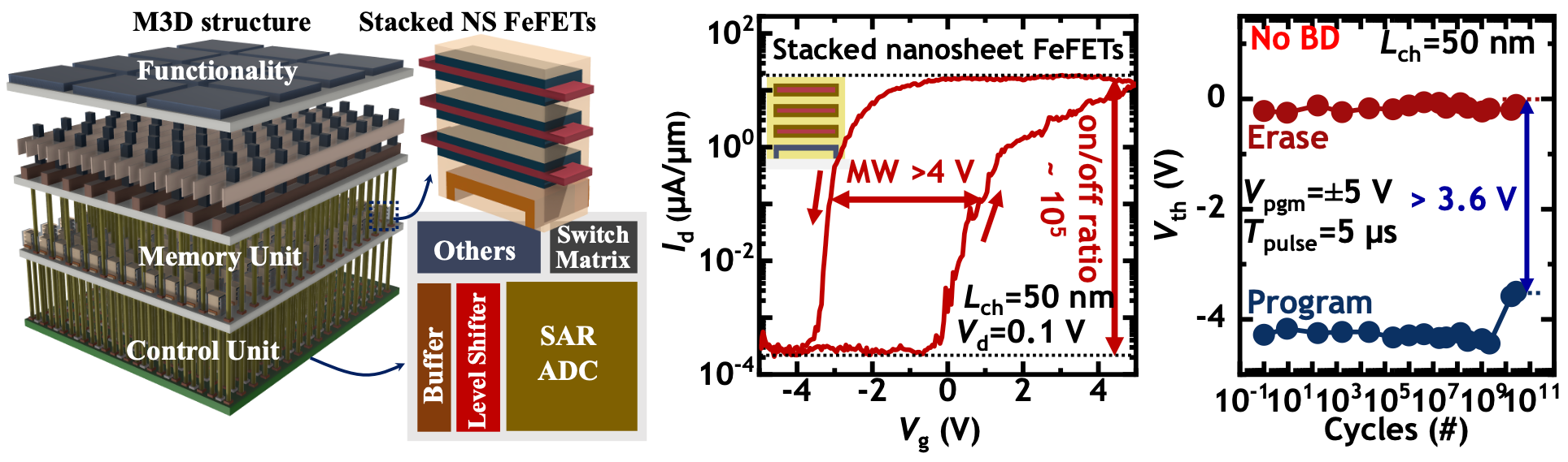 • 针对目前氧化物半导体沟道FeFET面临的擦除能力弱、存储窗口不足以及单层沟道结构难以满足结构缩放等瓶颈,课题组与新加坡国立大学龚萧教授团队从“三维堆叠FeFET架构创新”角度切入,首次提出并制备了后段工艺兼容的三层堆叠纳米片3D FeFET架构。该工作通过将三层氧化物半导体沟道与铁电介质薄膜集成,构建了MFMIS(金属-铁电-金属-介质层-半导体)三维结构,解决了传统氧化物半导体沟道FeFET擦除能力弱与存储窗口不足的问题,在HZO薄膜上实现了超过4 V的超大存储窗口。同时,多层堆叠结构使沟道面积较平面器件减少超过80%,并在50 nm超短沟道器件中仍保持电学特性稳定,器件耐久性超过3×1010次,展现出优异的可靠性与可缩放性。该研究突破了BEOL FeFET架构在密度、能效和工艺兼容性方面的限制,为实现大规模、低功耗、高能效的单片3D集成存储与计算系统提供了新的技术路径。ylzzcom永利总站线路检测2021级直博生冯扬和新加坡国立大学博士生王啸林为共同第一作者,陈杰智教授与新加坡国立大学龚萧教授为共同通讯作者。