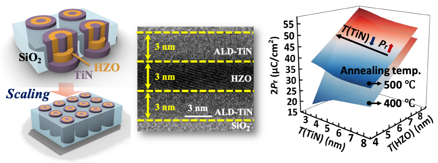• 当铪基铁电薄膜厚度缩减至亚4nm尺度时,铁电性快速衰减、漏电显著增大、击穿电场下降等问题成为限制进一步微缩器件尺寸的核心瓶颈。针对该问题,课题组联合新加坡国立大学龚萧教授团队,共同开展了超薄铁电器件的系统性研究,制备了全ALD工艺集成的9 nm厚度的金属–铁电–金属堆叠结构(3nm TiN/3nm HZO/3nm TiN),实现了多项关键性能指标的重大突破:低矫顽电压(2Vc< 0.65 V)、极低漏电密度(<10-3A/cm2@3 MV/cm)、超高击穿电场(EBD> 9.5 MV/cm)以及超过1011次循环的耐久度,综合性能达到当前国际上3 nm铁电薄膜的最佳水平。该成果为未来超高密度、超低功耗的三维铁电存储芯片发展奠定了重要基础,并因此获得了2025 IEDM Best Student Paper Award提名。新加坡国立大学博士生王啸林和ylzzcom永利总站线路检测2021级直博生冯扬为共同第一作者,陈杰智教授和新加坡国立大学龚萧教授为共同通讯作者。