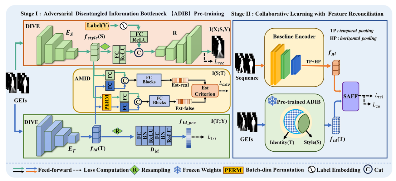 针对该现状,团队创新性地提出了一种“对抗解耦信息瓶颈(GaitADIB)”网络框架。该方法从信息论视角出发,创新性地引入信息瓶颈理论,将由视角引起的差异建模为一种连续、通用的‘风格’特征并加以解耦。团队设计了“双信息变分编码器”,利用信息瓶颈和变分推断原理将身份特征与风格特征初步分离;同时,引入“对抗互信息解耦”策略,通过对抗训练最小化身份和风格表征之间的互信息,打破了身份与风格特征之间的残余耦合,确保了身份特征真正独立于视角变化。